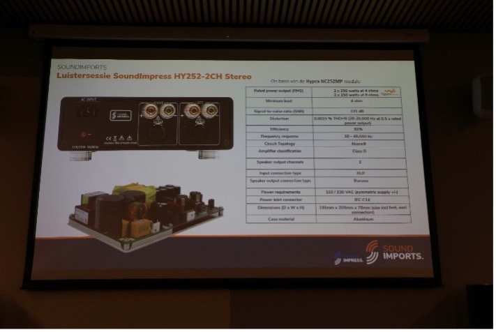 Vervolgens was het tijd om de versterkers te beluisteren. We startten met de Purify (d.w.z. de SoundImpress PU400-2CH) en na de pauze was het de beurt aan de Hypex Nilai stereo versterker. Een overzicht van de specificaties van beide stereo eindversterkers is weergegeven in resp. foto 2 en foto 3.