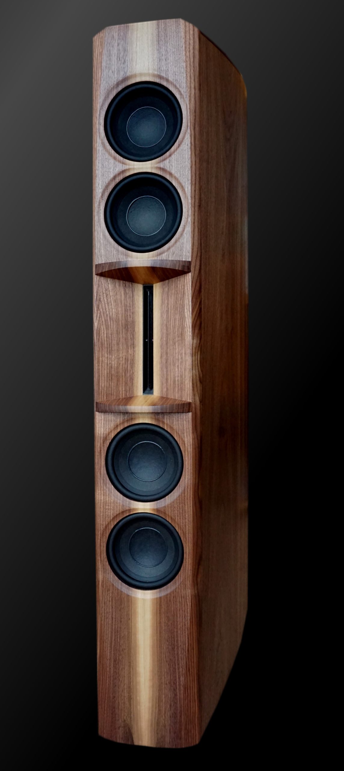 Joep heeft de fronten van de speakers gemaakt van massief notenhout, die hij spiegel-symmetrisch heeft verlijmd. Dit was de een uitdaging. Het lichte spinthout komt door de spiegeling fraai naar voren. Het front van de speaker is zo slank voor een zo chic mogelijke uiterlijk en om met name ongewenste reflecties te beperken. De zijwanden van multiplex hebben een kleine kromming en zijn ook spiegel-symmetrisch voorzien van notenhoutfineer, wat naadloos aansluit op de fronten.